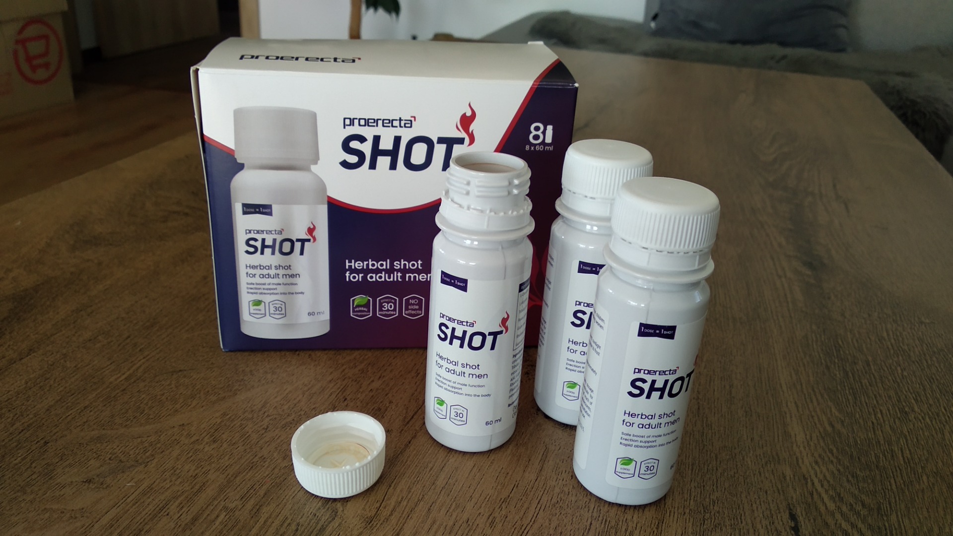 Proerecta SHOT je nápoj, který se dodává v balení po šesti kusech (nově po 14 kusech). Obsah jedné lahvičky je 60 ml (nově pouze 25 ml). Jedná se o jakýsi džus s příchutí broskve, který je velmi chutný a hezky voní. Jediné, co mi na tom nápoji vadí, je trochu trpká příchuť, která je způsobena extraktem ze semen vinné révy.